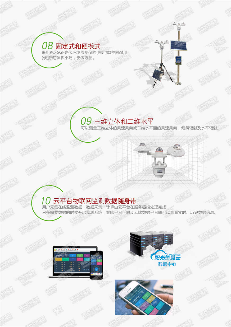 本產(chǎn)品除了可同時(shí)監(jiān)測(cè)環(huán)境溫度、環(huán)境濕度、風(fēng)速、風(fēng)向、氣壓、雨量五大環(huán)境基本要素外,還可以監(jiān)測(cè)光伏電站環(huán)境系統(tǒng)中所必須的太陽(yáng)輻射(水平/斜面)及組件溫度等要素。特別采用了高穩(wěn)定性的太陽(yáng)總輻射傳感器,具有完美的余弦特性、快速響應(yīng)、零漂移和寬溫度響應(yīng)的特性,非常適合太陽(yáng)能行業(yè)的輻射監(jiān)測(cè)使用,兩臺(tái)角度可以任意旋轉(zhuǎn)的總輻射表可滿足光伏行業(yè)光功率預(yù)算需求,是目前最適合光伏電站上使用的領(lǐng)先級(jí)的一體化便攜光伏環(huán)境監(jiān)測(cè)儀。